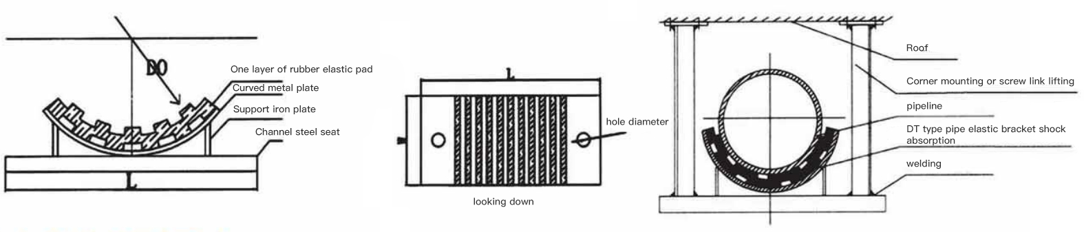 The DT type pipe elastic bracket shock absorber is made of an arc-shaped concave and convex rubber elastic pad and a partially pasted arc-shaped metal plate.
